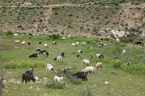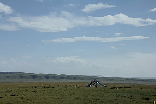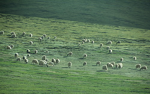 沿著鐵路行走中見草原上似珍珠般的羊群
