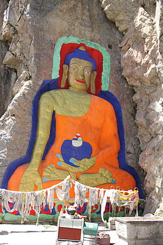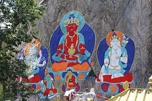 『聶唐大佛』屬於摩崖石刻,高度接近10米,歷史悠久,是西藏最大的室外石刻佛像。佛像莊嚴慈祥,嘴唇微彎起,如向著信徒發出笑意。另外一幅佛像中,見到三個佛畫像,同樣的和藹可親,笑嘻嘻的樣子,很卡通啊!