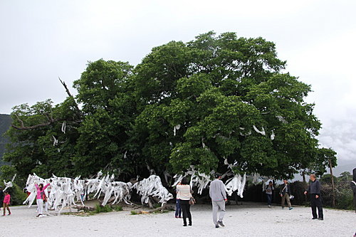 車子經過邦納村時,見到一棵樹齡1600多年的古桑樹,據說是松贊干布和文成公主親手栽種的,原為雌雄兩株,現僅剩一株雄樹。這棵古桑樹須然有很長樹齡,仍見樹木枝葉茂盛,盤根錯結。我們都不大理會傳說是真或假了,拍過照片,以作留念。