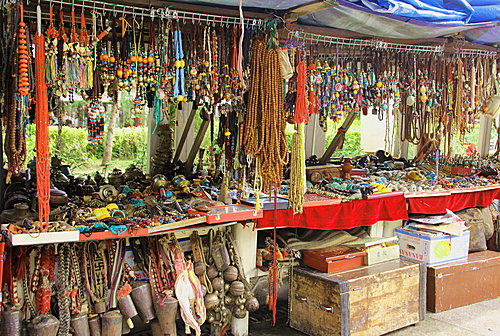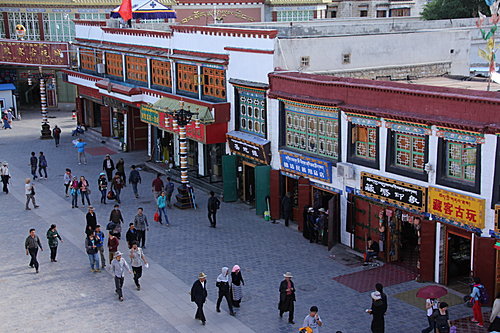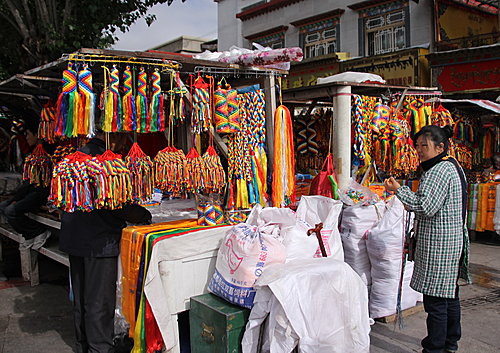八角街兩旁擠滿各式各樣工藝品商店或攤販,擺放著富有藏族、尼泊爾等特色的手工藝品。我沒有購買昂貴的道地珍品。如:冬蟲草或寶石;只是買了富有藏族的轉紅筒、布裝飾品和犛牛梳而已。
