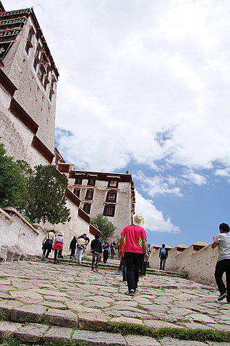 雄偉的布達拉宮,屹立於紅山頂上。是當今世界上海拔最高(3750m)的寺院。而且更是西藏境內最完整的一座宮殿式古建築。共有13層,由紅、白、黃三種顏危組成。紅宮主要供奉歷世達賴喇嘛的靈塔,此外還保存著松贊干布、文成公主、尺尊公主等珍藏塑像。不過,無論各個宮中有珍藏的佛像、唐卡、古書、珍藏珠寶…….等。都禁止拍照,只可在外拍攝建築物的外觀。我們為了把握時間,在各個宮層拍照。對導遊的宗教解說,都只是略有概念!