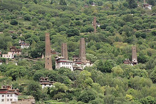 隔河觀眺梭坡藏寨的古碉群