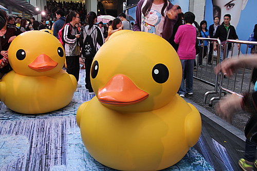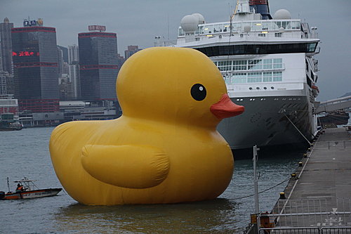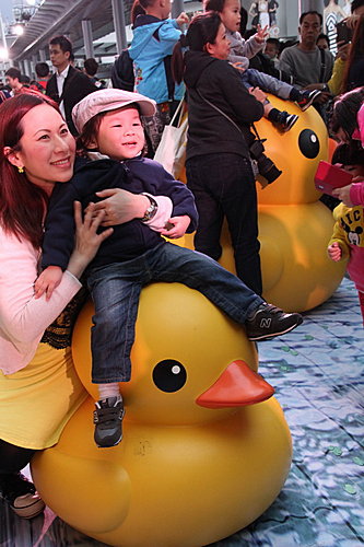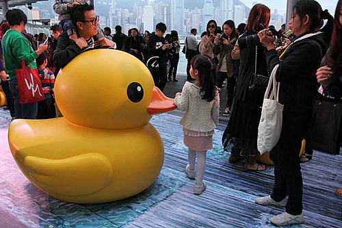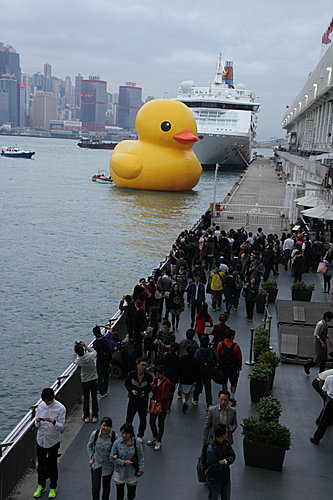 橡皮鴨由青衣船廠至尖沙咀間漫游後,終於在海運碼頭停泊。近千「鴨粉」早在5月2日在尖沙咀恭候了!我就在這日傍晚到達,看看這傾倒眾生的「黃巨鴨」。